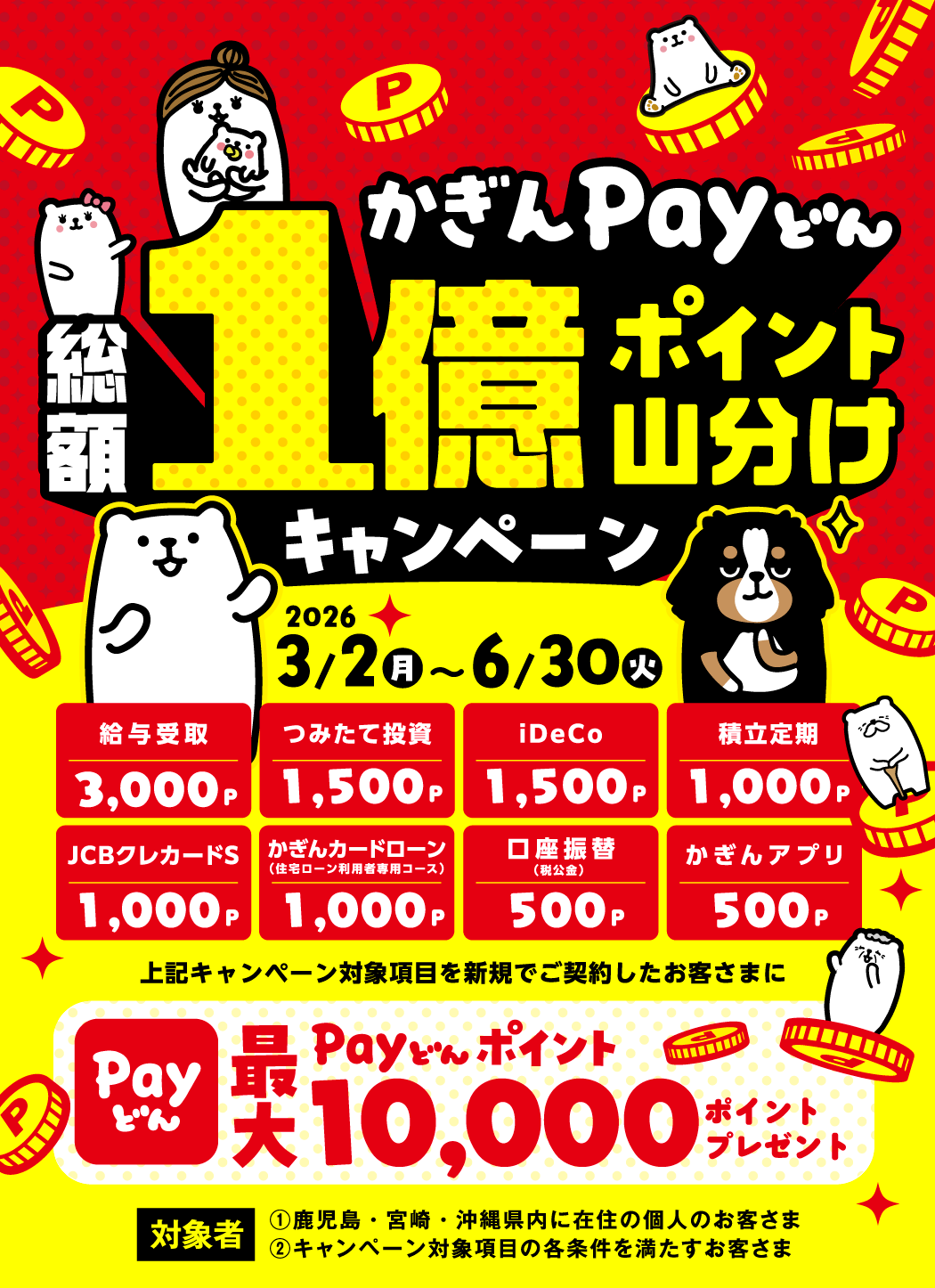 - ●Payどんポイントのお受け取りには、キャッシュレスアプリ「Payどん」をダウンロードし鹿児島銀行預金口座を2026年7月31日までにご登録ください。